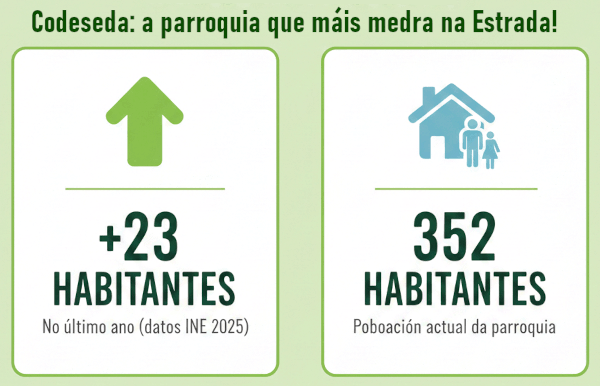 A recente análise dos datos publicados polo Instituto Nacional de Estatística (INE) a data de 1 de xaneiro de 2025 deixa un titular indiscutible no rural estradense: Codeseda é a parroquia que máis crece.